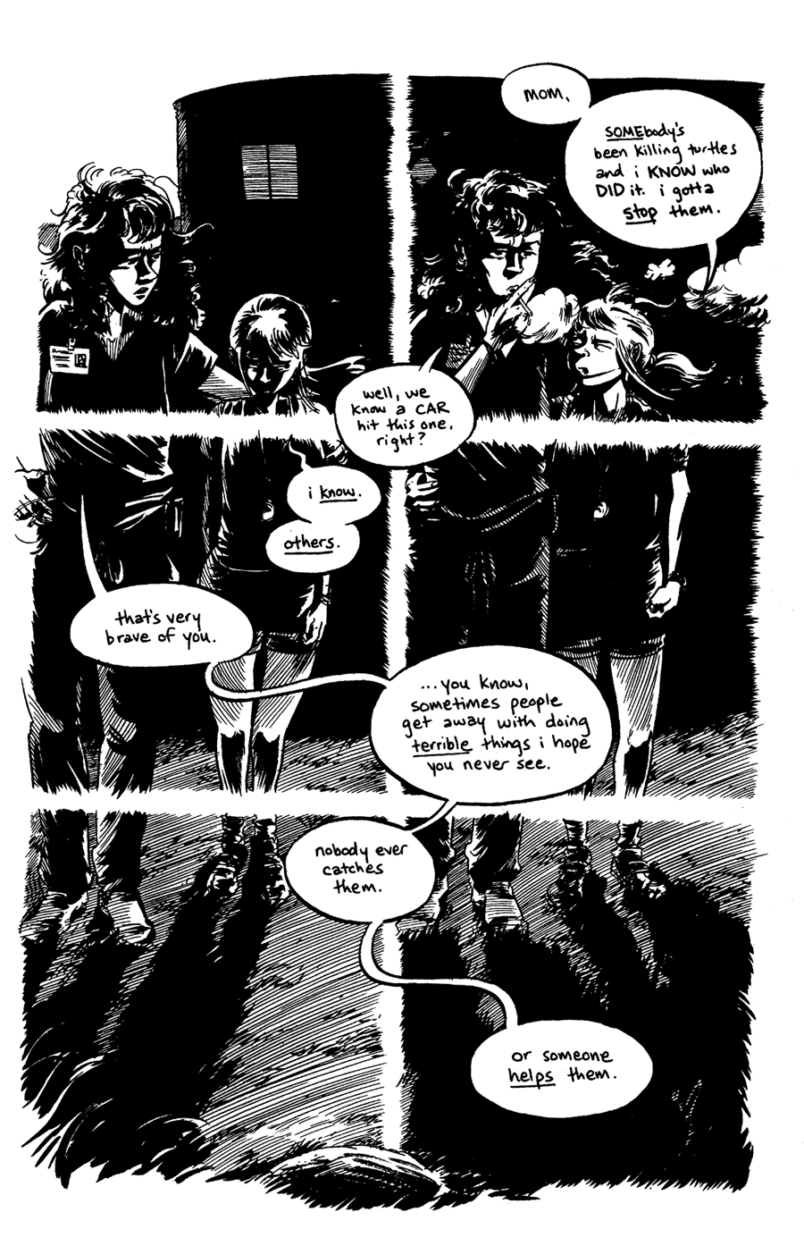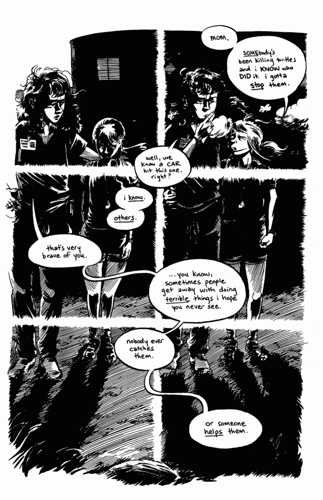 I think this page is brilliant by any standard. Powell takes two sequential full-length portraits of a mother and a daughter and then splits them into six. The way that we read comics (left/right/down) means that we are forced to combine all of the aspects of the two distinct times into one scene. The scene is supposed to resonate in our mind as a clean cut of a film, showing a woman comforting her daughter while smoking, and the camera pans to their feet before it cuts to a different scene (in this case, another page). The dialogue also pushes us along, taking the reader from the faciality of the page into the mixed tones of the lower panels, which also mimics the subject being discussed; violence, and shame about violence, makes us look at our feet. We should feel like children, and at that point in the narrative, I was ashamed of what I knew was going on. You’ll have to read it to see what I mean.