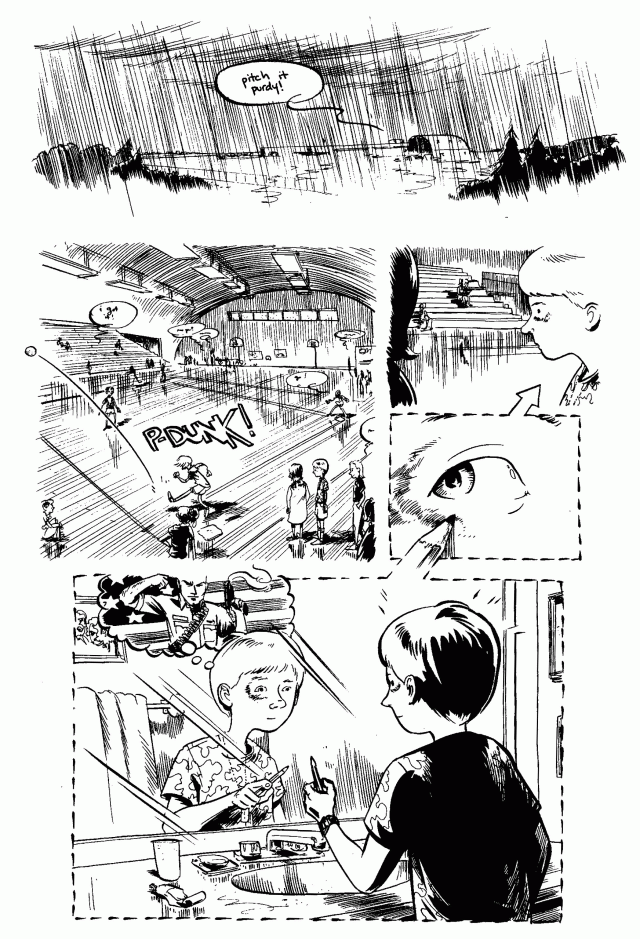 The dotted line panels are obviously flashbacks, and explanatory ones at that. I think there’s something more brilliant going on, though, and it is the sense of space that Powell gives us. We start with a wide establishing shot and move into a gym. We don’t stop there, however. We get a close up of on intense expression with a bruise under it, and we zoom in even more, but this time back into the past. Then we zoom out, still in the past, a transition between the present and history that was breached seamlessly, and we have a panel of the past that is bigger than anything else on the page. Within that, we have a smaller panel of a dream, a wish, a thought.