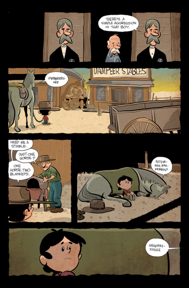 I know that any half-smart writing about the Western United States automatically draws comparisons to Cormac McCarthy, but come one, this is classic McCarthy stuff. There is a “simple aggression” in Boyd, but it isn’t something that we see in the comic. Instead, we see a calculating boy who constantly overwhelms the expectations of those around him, defeating small-town sheriffs and hooligans alike. The simple aggression is hidden from us, part of the opacity that surrounds Boyd. That final panel, where Boyd looks both sad and thoughtful, is one of the few moments where we see him as an actual child. A kid and a horse, laying down for the night, ready to do it all again tomorrow.