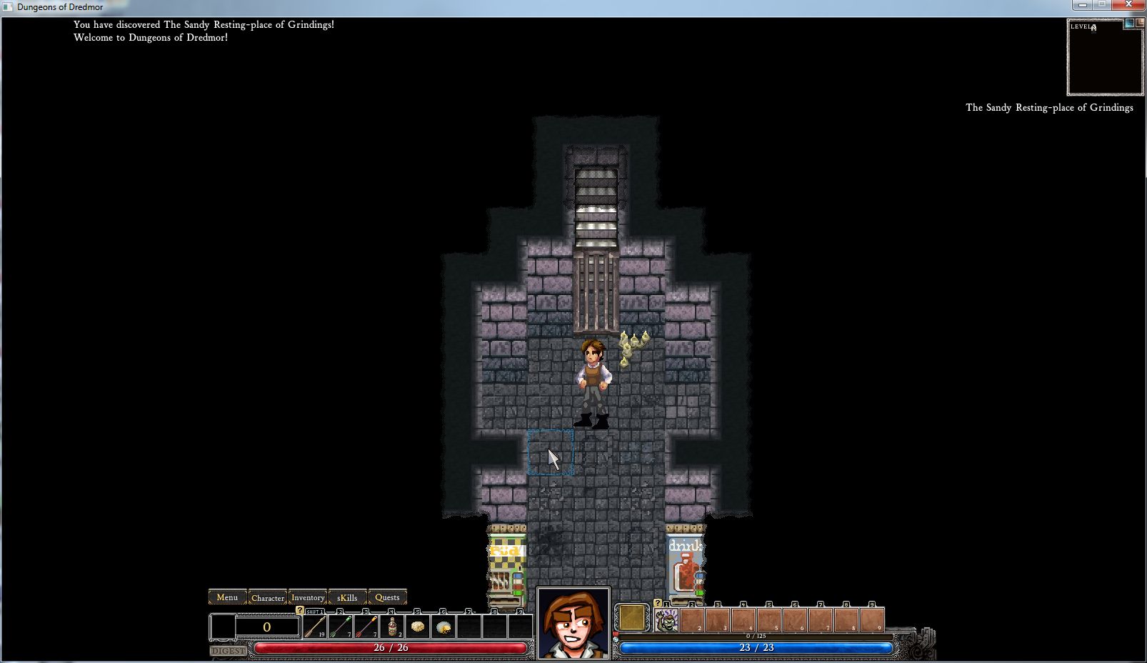 Larry O’Punchy was created to be an unarmed fleshmancer, a guy who would beat enemies to a pulp and then craft that pulp into a cool bro who would follow him around until the end of his days. That was the plan, anyway. I entered the dungeon by stairs, which is a lot more of a friendly entryway than most dungeons. A grate crashed down behind me. I saw some vending machines.