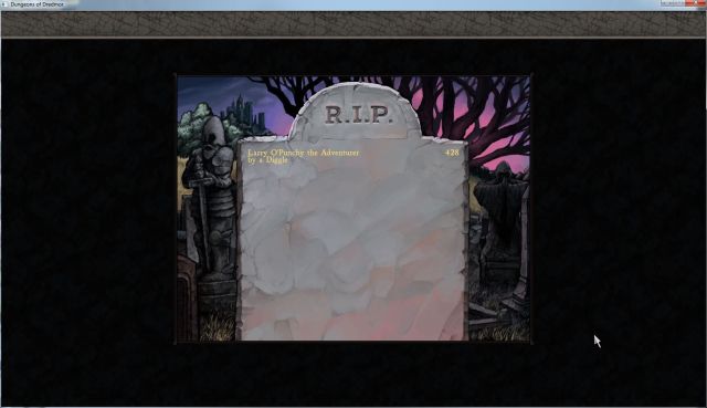 Cut to me. I am sitting in my chair, yesterday, and I fire up Dungeons of Dredmor for the first time. Ah, I think, this game is a comedic game and a roguelike. I will die a lot. I will make a parody of Permanent Death on the blog. It will also be funny.