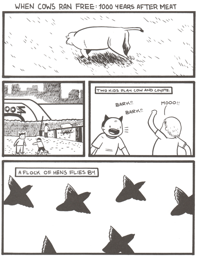 The most profound takeaway from the whole anthology is Box Brown’s comic that ends the collection, “When Cows Ran Free: 1000 Years After Meat.” Brown gives us a world where cows can run free, but kids are still mean to other kids who they don’t like for stupid reasons. There’s a beautiful reading of the comic–humans and cows will always be meat, but just like kids grow up and stop being mean for no reason, maybe the human/animal relation will change.