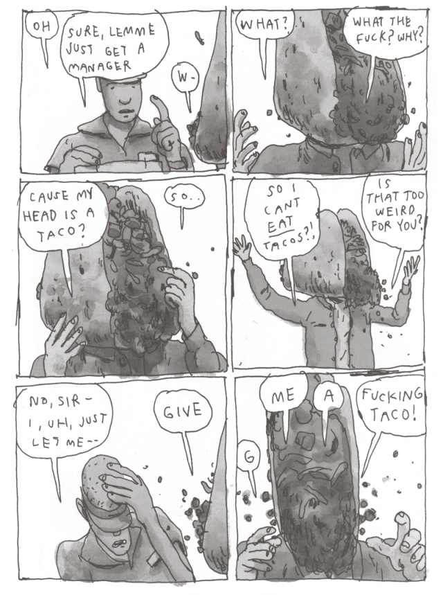With that in mind, I was drawn to certain stories in the text. Victor Kerlow’s “Taco Head,” about a person with a taco for a head who wants to eat a taco, is both brilliantly satirical and wildly open to interpretation. A page below: