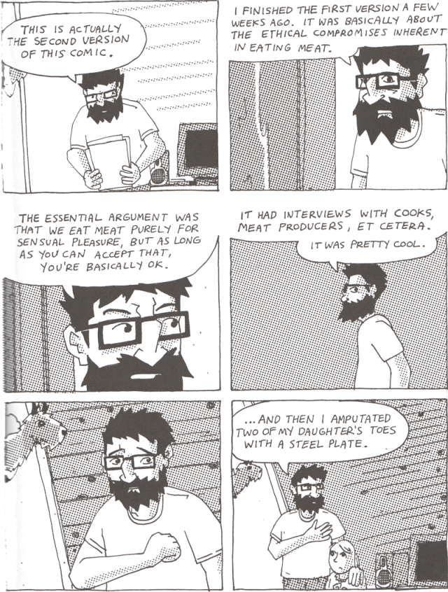 I’m happy with my purchase, though not for the Kochalka piece (I love James’ work, but I don’t even think that he makes an argument for eating meat so much as he demonstrates the ethical knot at the center of eating practice and then goes “well, meat is tasty! whoopeee!”).