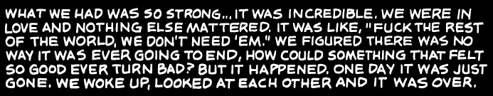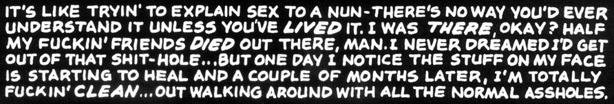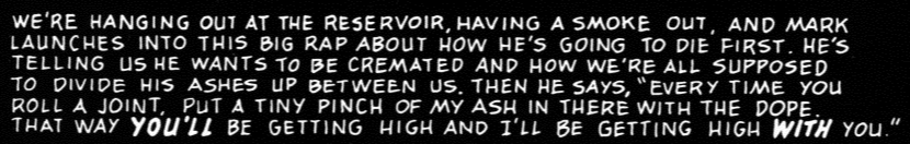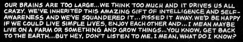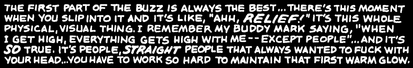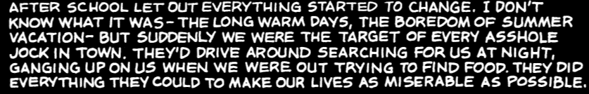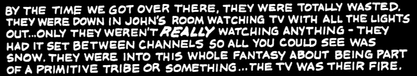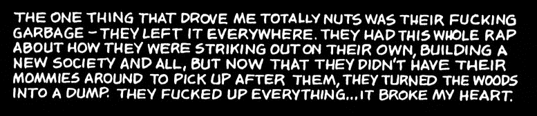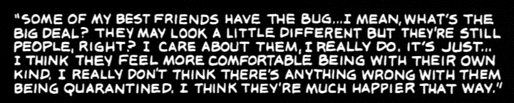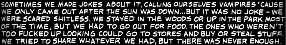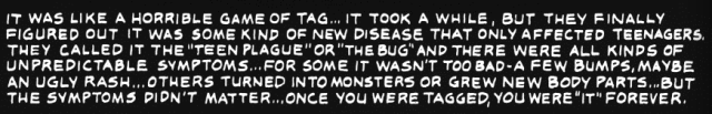 The opening pages of the individual comics, rather than the collected edition that I linked above, have small paragraphs that are part of what seems to be interviews. That is, at some point in this fictional world, someone performed interviews about The Bug and about the teenagers who spun off from society and went to live in the woods. A commune of disease and whatnot.