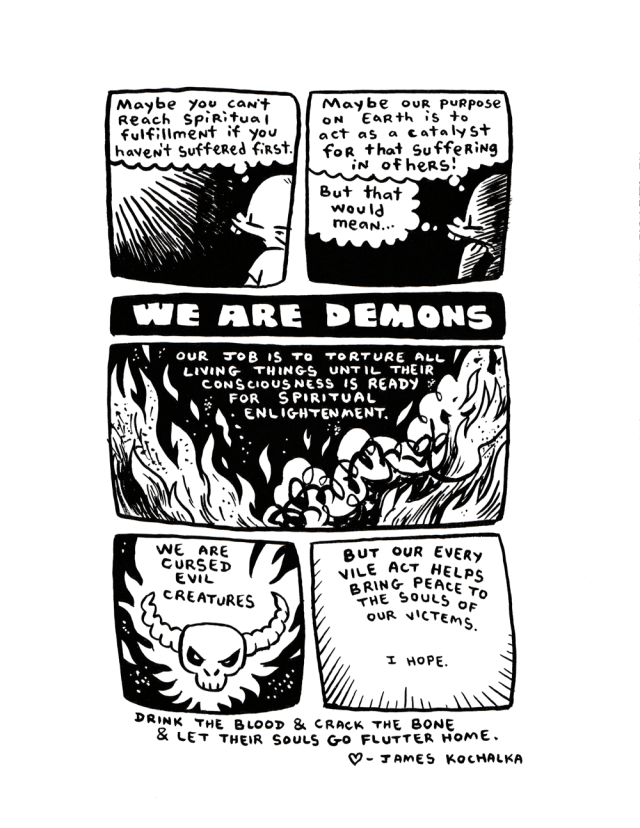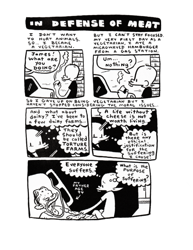 I wrote a little bit about how unhappy I was with James Kochalka’s “In Defense of Meat” a few days ago (in the context of a much larger, glowing review of Digestate.) James commented that he thought that I was misrepresenting his argument, which is probably true, and so I asked if I could post his contribution to the anthology.