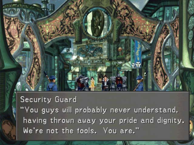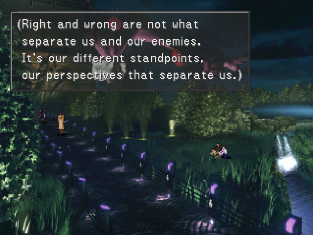 7. I don’t think there is any argument about the complexity of the pre-FF8 Final Fantasy games when it comes to morality: there are good guys and there are bad guys and there are very few greys in between. Final Fantasy VIII breaks with that by immediately positioning the player as complicit with the teenage mercenary trade, and the critique extends explicitly into the game via a story about “the sorceress and her knight.”