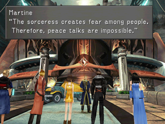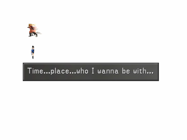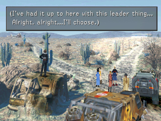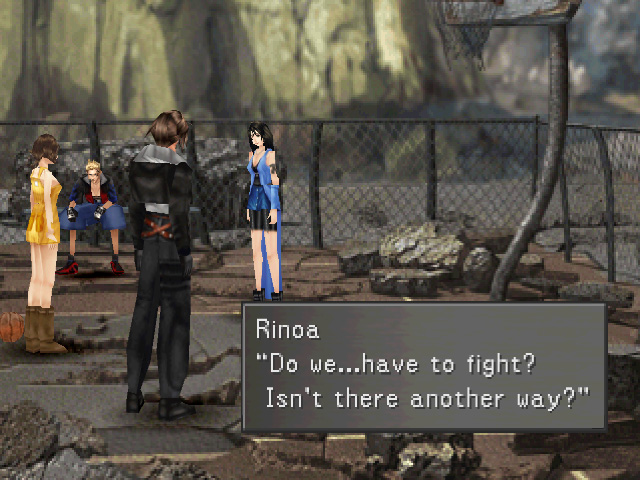 So like…this is what I wanted to say. Let’s see… Oh yeah. I understand what Rinoa’s saying. I understand, but still I’m gonna fight. I want to stay true to everything I’ve stood for. I’m sure it’s the same for everyone. That’s why I thought it’d be best if everyone knew we would have to face Matron. You’ve all heard this before. How life has infinite possibilities. I don’t believe that one bit. There weren’t many paths for me to choose. Sometimes, there would only be one. From the limited possibilities I faced, the choices I made have brought me this far. That’s why I value the path I chose… I want to hold true to the path that HAD to be taken. I know our opponent is Matron, whom we all love very much. We might lose something very important on account of the GF. But I don’t mind. It’s not like I drifted here on the tides of fate. I’m here because I chose to be here. And more importantly… We all grew up together. But due to various circumstances, we were all separated. As a kid, you couldn’t really go out on your own… There were no other paths to take… All I did was just cry. But… – [Irvine]