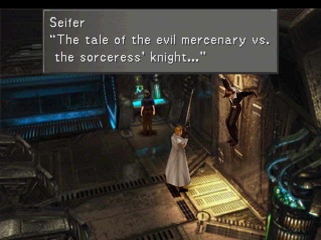When Seifer, the rival of player-insert Squall, defects to the side of the Sorceress Edea, it is under the guise of becoming her knight. We’re introduced to the concept in snippets–the knight does the sorceresses bidding. He is her love and her weapon arm. Later in the game and further back in time (inside a parallel narrative), we see a character named Laguna playing the Knight in a cheap film recreating a classic fable that involves the knight protecting the sorceress from a fearsome (yet fake) dragon. The scene is interrupted when a real dragon shows up; as RPG rules decree, a battle ensues.