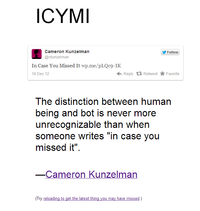He, because he is an amazing person, immediately took it upon himself to create In Case You Missed It. It, as I understand, searches twitter for the most recent usage of the phrase “in case you missed it” and displays that tweet. It updates in real time, and refreshing the page gives you the most recent result.