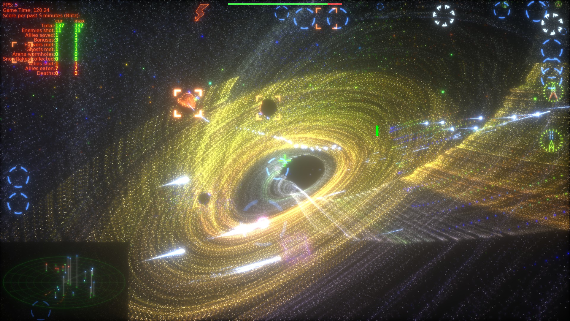 The menu system is packed with options and filters and choices of visualization. A few menus down, there is a plainly-labeled “Music” that allows you to pump the world full of the sounds of your choosing. I flipped through my music for a while, trying to find something appropriate, although I can’t tell you what kind of music is appropriate for flying around in nonspace doing nonsense things until the screen goes glitchy and you have to start all over again.
