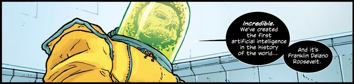 To be clear, I think that the scope of the comic is brilliant. FDR is turned into a superintelligent AI after his death, Enrico Fermi is revealed to be some sort of nonhuman or alien lifeform, and Harry Daghlian will live for 24,000 years as a skeletal weapon of mass destruction because he accidentally touched the Demon core. As entertaining as these reimaginings of science and history are, I can’t help but feel that they all fall a little flat.