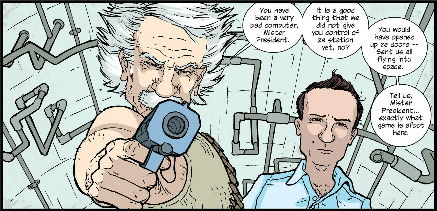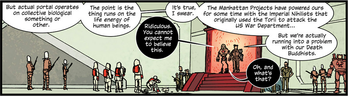 I will close with a huge, gaping problem. In a world of fiction, where you have the opportunity to blend fiction with fact to make something unique, why would you choose to completely eradicate women? There have been ten issues of the comic so far. There are around 30 pages in every issue. In 300 pages of a fictional history of science, there has not been a single woman. I will be up front with it: that’s fucked up, and it is wrong. I mean, holy shit, at least take a look at Wikipedia to find the massive number of women who have made significant contributions to science during the time period that the comic is set. Additionally, I don’t think there have been any people of color short of Japanese death cultists.