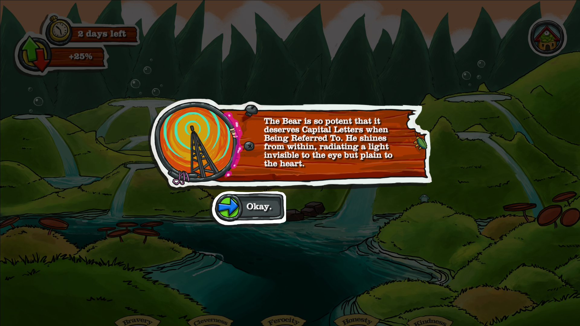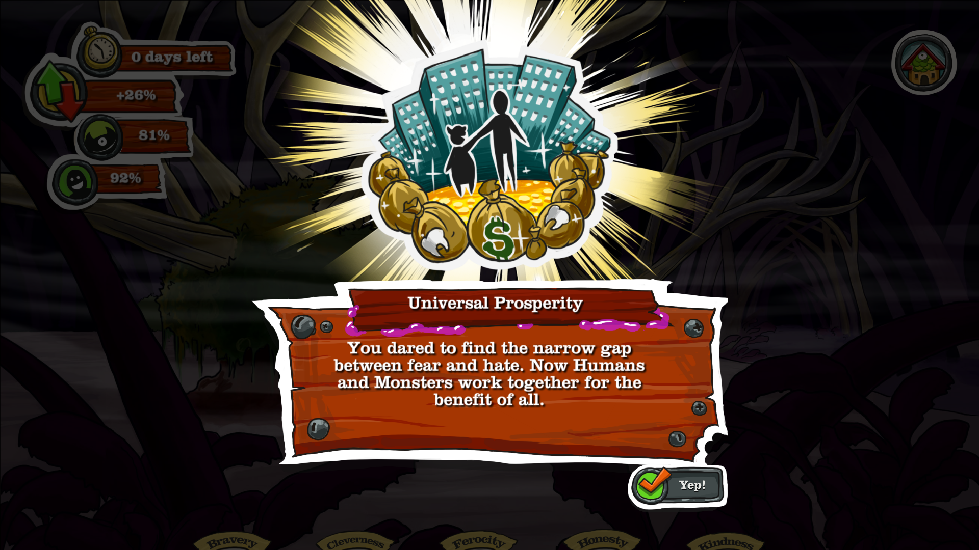 Monster Loves You! is somewhere between a dating sim, the moral choices of a Mass Effect game, and a text adventure game. The choices that one makes, and the opportunities that one has, change every game. No monster grows up the same. Not every moment and problem is solvable by the monster the player has at hand, and there were times in the game where I wished that I had been more brave as a child, or been more ferocious, so that I would have more tools with which to make monsters less afraid of humans.