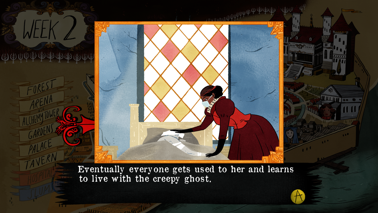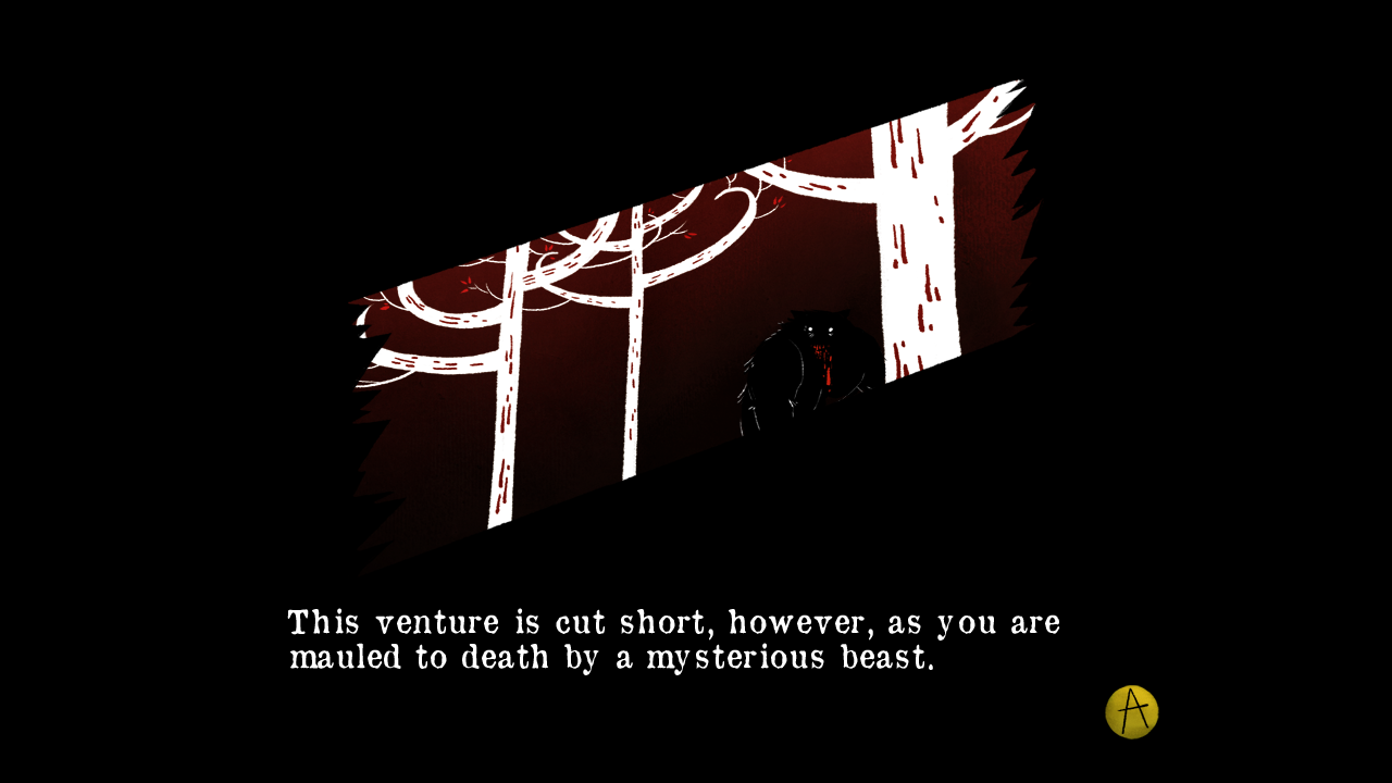 The aesthetic of the game carries this emotional content into the visual realm of the game. While the writing works, and is often a mix of melancholy and humor, it is Emily Carroll’s illustration style that best mixes in the vitality of life before the coming of the Yahwg with the bleakness of knowing that it will come and tear everything in two. Her comics work, which you can read me writing about here or just look at here, has always contained this tension, and I’m really glad that we get to see her work in this format now.