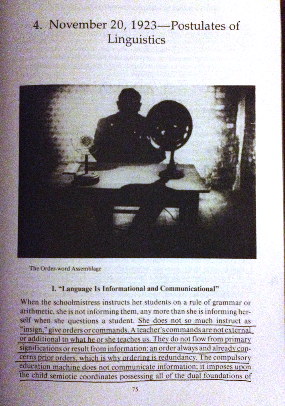 It is weird to see what has changed. High school me read with a heavy-flowing, wide-tipped pen and underlined every political passage in Anti-Oedipus with wild abandon. I remember making the lowest possible score without failing in a math class my final semester in high school because I was working through A Thousand Plateaus. I have no idea what I got out of it other than a 90% underlined “Micropolitics and Segmentarity.” In any case, as Deleuze and Guattari write in “Rhizome,” the books caught me up in themselves. They crept through me and changed how I thought. When I was sixteen, I was reading them not as philosophy, but as wildly evocative fiction, nonfiction, as an announcement of totally weird shit involving history and Nietzsche and apparatuses. I was enthralled with a story about philosophy bound up in a lecture by Professor Challenger, who slowly explained big and strange concepts to me while slowly becoming a monster. It was exciting and new and encouraged me, via philosophy and critical theory, to be where I am today.