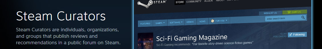 Steam Curation was released a few days ago. The gloss on it is pretty simple: groups can now create lists of recommended games in an effort to solve the “there are so many games on Steam” discoverability problem.