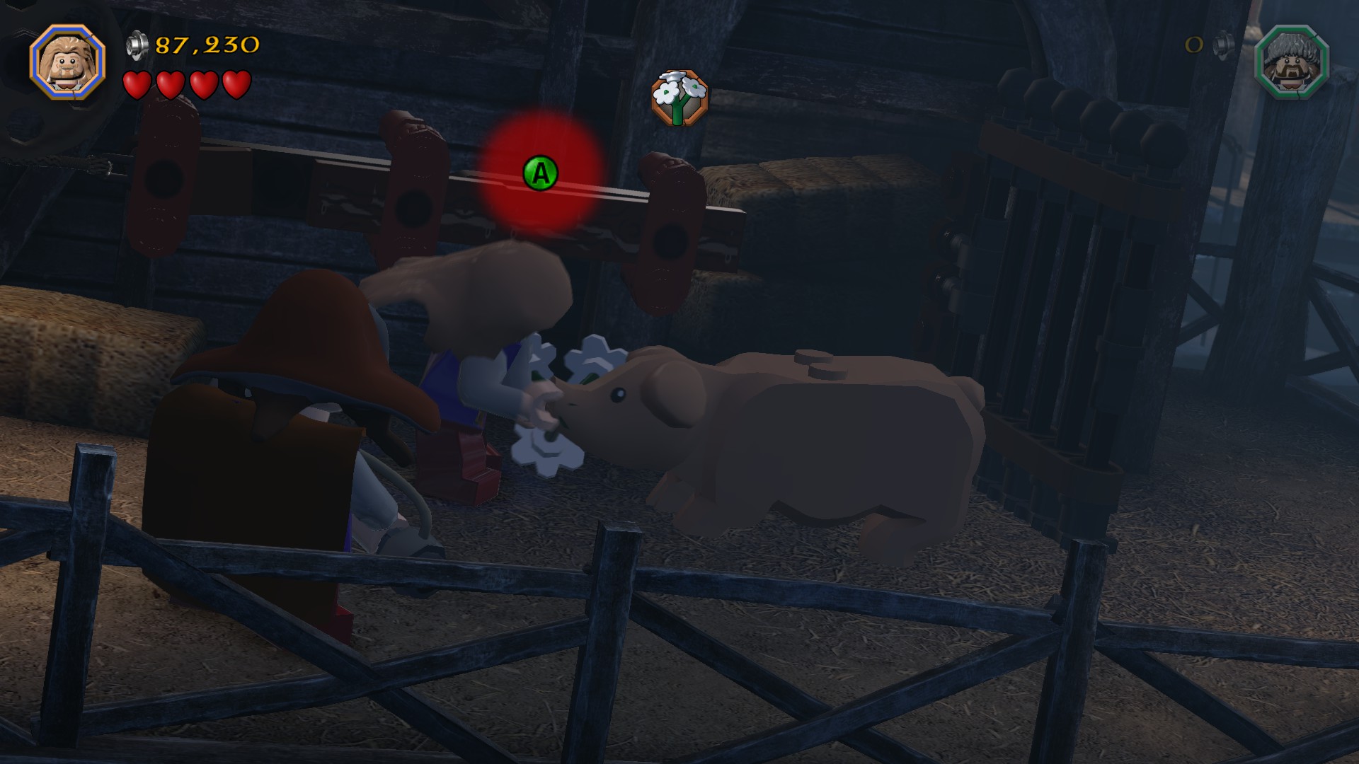 In LEGO The Hobbit, a game I have been playing a level at a time for months now, there is a level where you have to run around and find a pig who has stolen some herbs that the dwarves need for some arcane, plot-based purpose. After some LEGO hijinks, you find the pig and engage in combat with it. Or, rather, the mechanics that you’re using are the combat mechanics: a prompt appears on screen, you smash the button for the prompt, and then you win the fight (normally by lopping off an enemy’s head).
